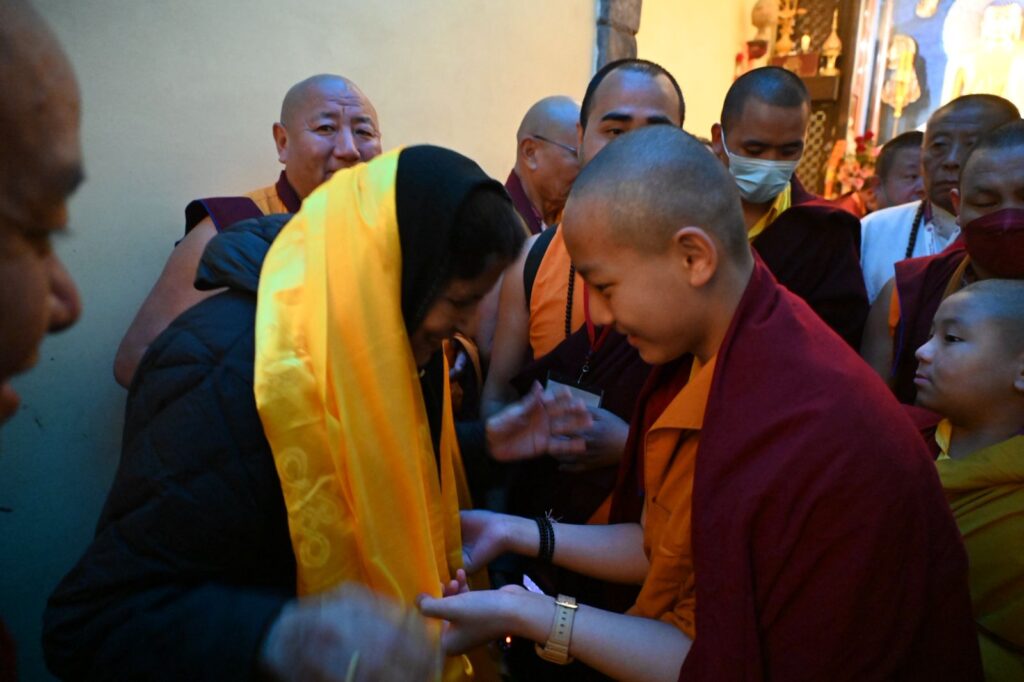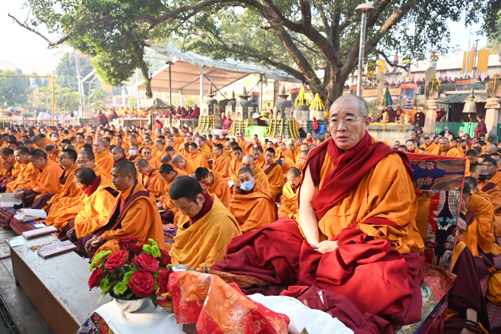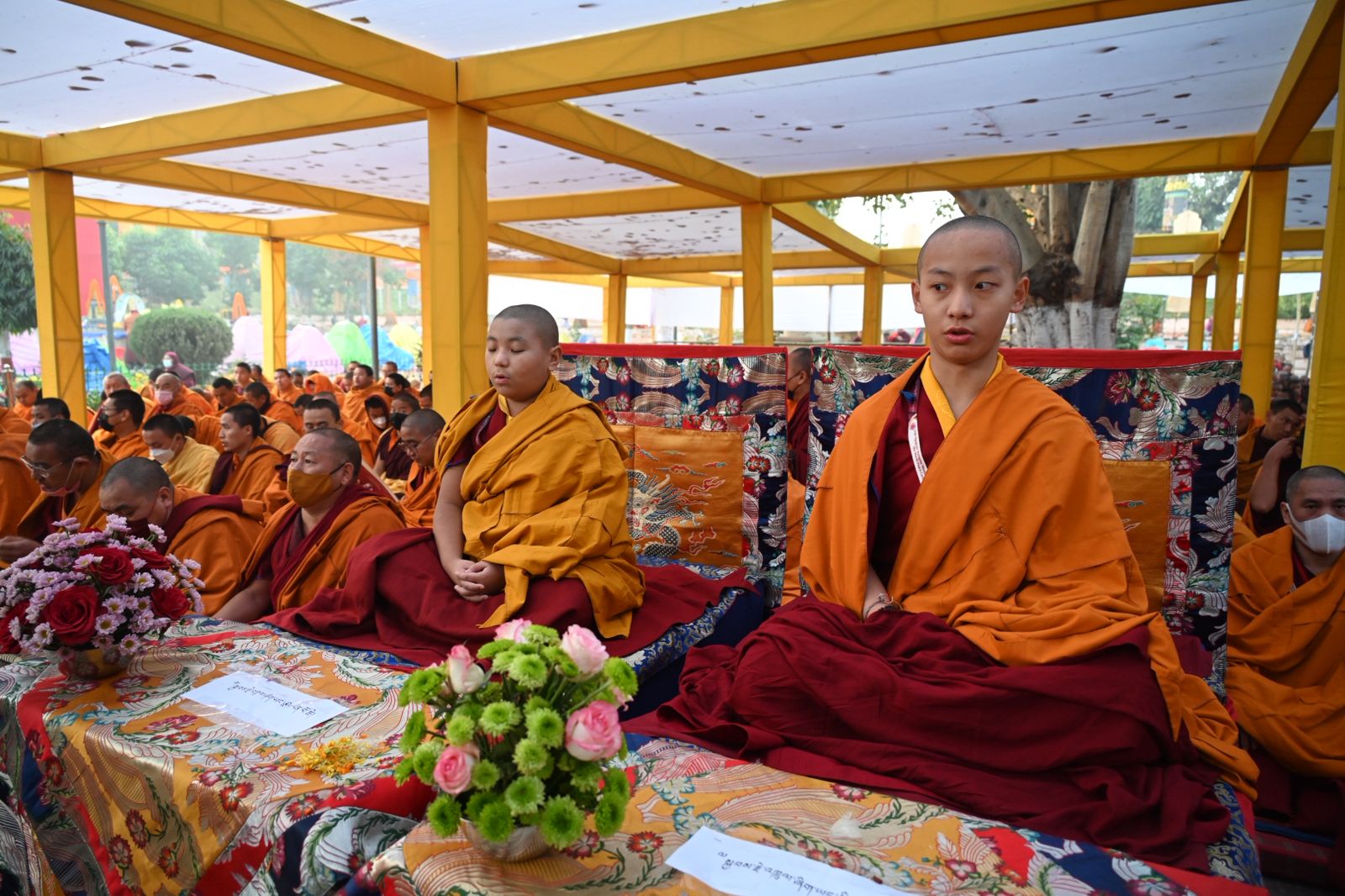 The ceremony is being led by eminent spiritual masters, with high-ranking Rinpoches and Tulkus heading the puja at each cardinal direction of the temple complex. On the eastern side, the ceremony is being guided by Tulku Sangngak Rinpoche, Gonpo Tulku Rinpoche, Khandelwal Kunsang Chodon, and Lama Sonam. The southern side is headed by Khabar Minling Khenchen, Khabar Garab Rinpoche, Khabje Tulshik Rinpoche, and Tulku Panam. The western side is led by Khabje Musang Rinpoche and Khabje Gangkhang Rinpoche. On the northern side, the ceremony is being presided over by Khabje Kathok Situ Rinpoche, Dungsey Jigme Rinpoche, Namgay Dawa Rinpoche, Gongjang Rinpoche, Lachung Rinpoche, and Ghepa Rinpoche.