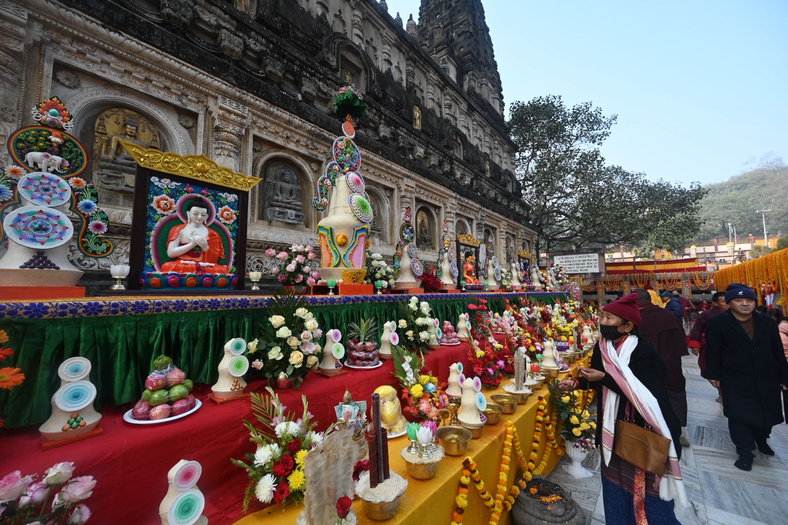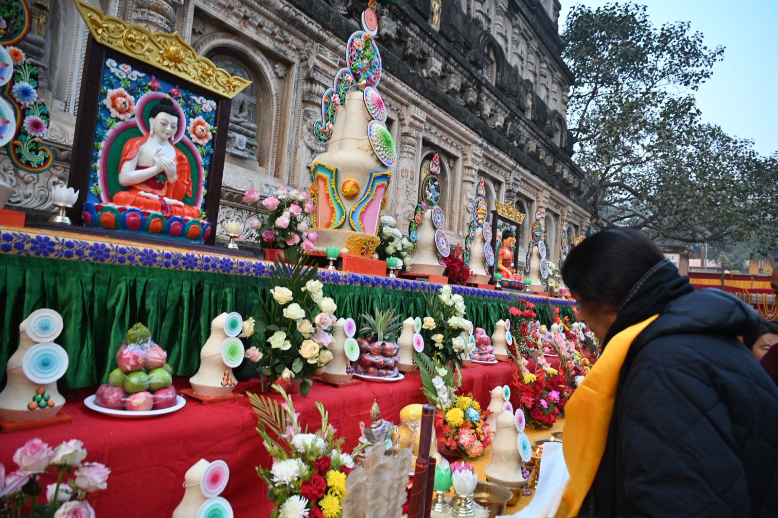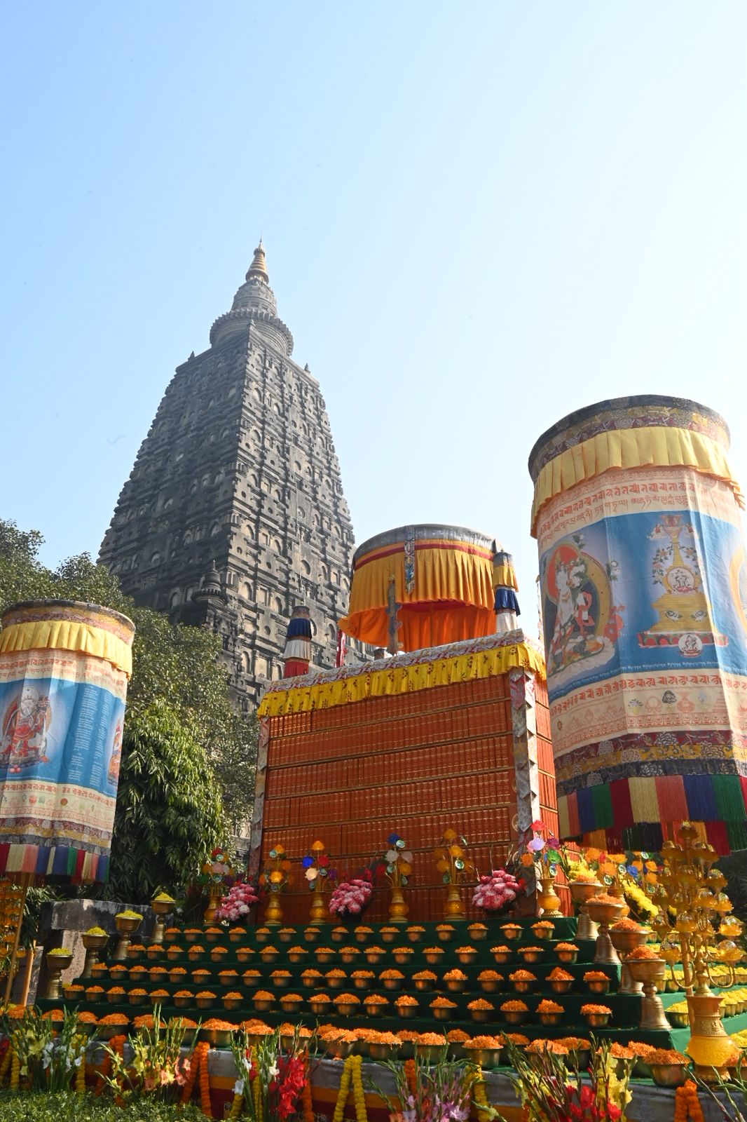 The entire Mahabodhi Temple complex has been beautifully adorned with colorful prayer banners, intricately prepared ritual Tormas depicting the twelve forms of the Buddha in different colors, and large sacred scrolls portraying Lord Buddha and Guru Padmasambhava. The votive stupa complex has also been artistically decorated with fresh floral arrangements, lending the sacred site a grand ceremonial and festive appearance.