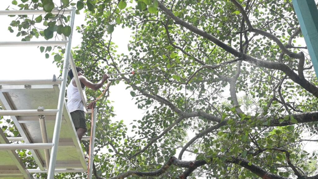 As is common during the onset of the monsoon season, some minor infestation by mealybugs was observed on a few small branches. In response, a chemical spray was applied under the supervision of the Scientists. Additionally, as a precautionary measure, a mild treatment was administered to ensure the continued well-being of the tree.