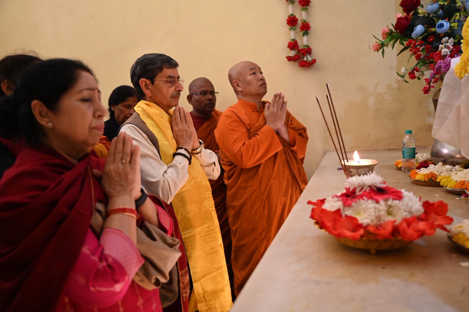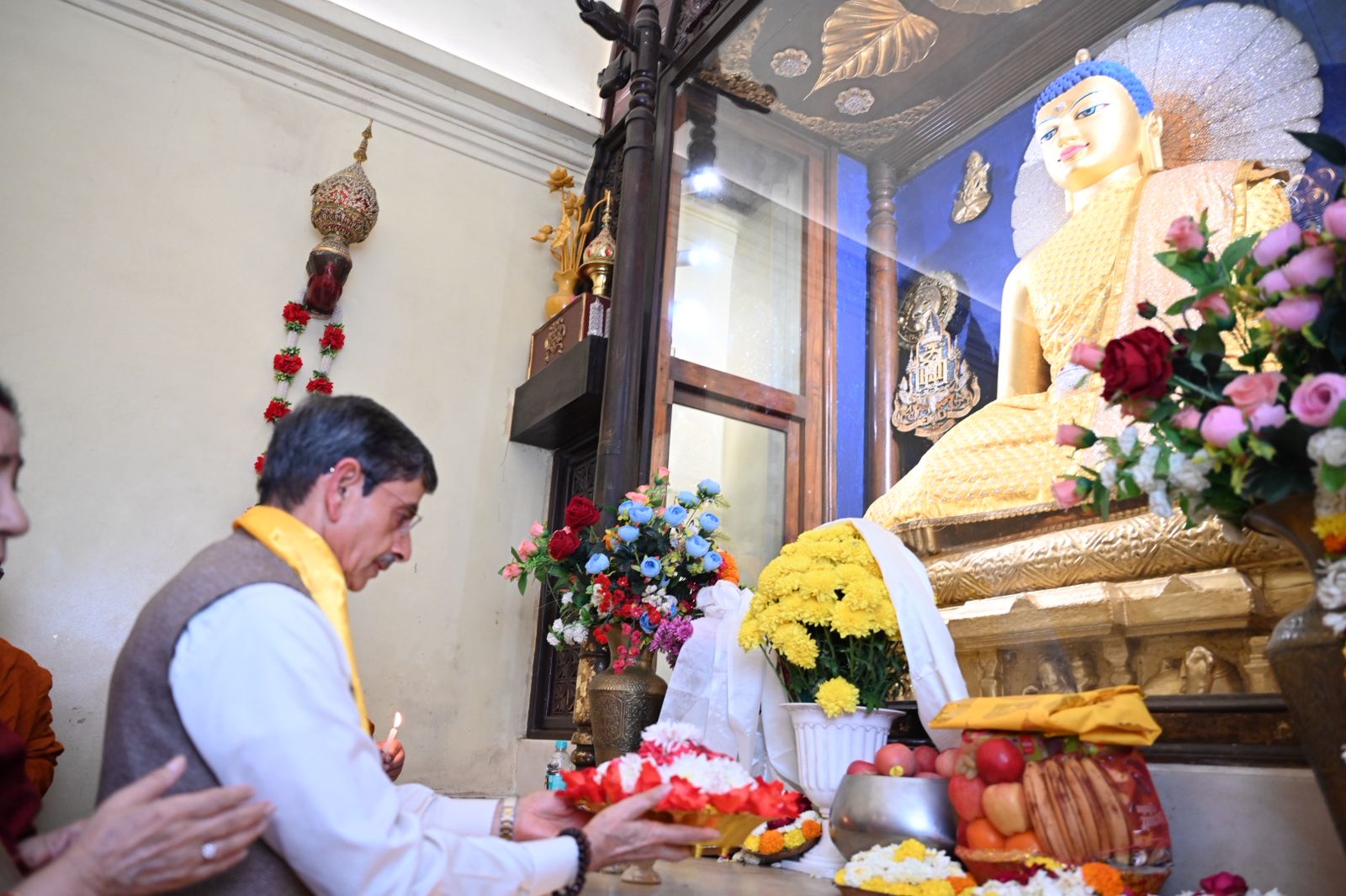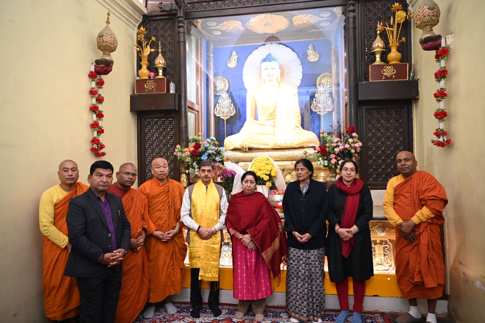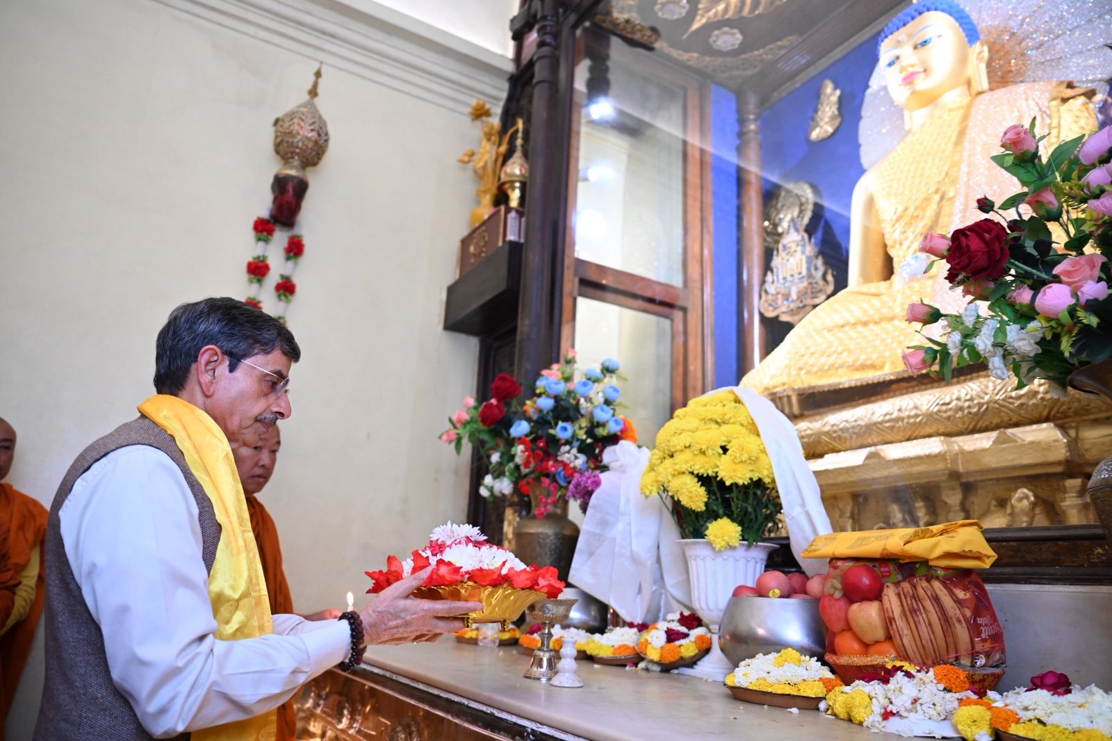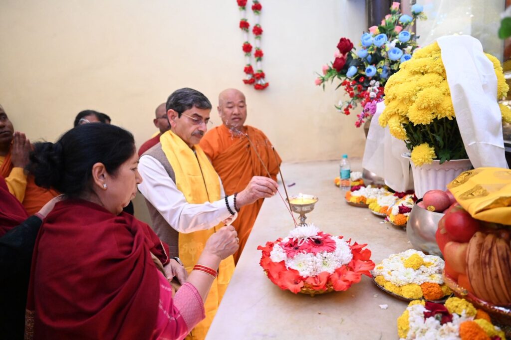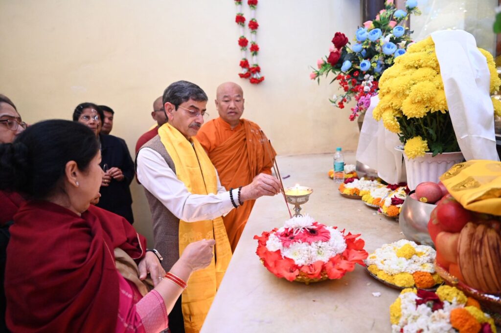 Upon his arrival at the sacred temple complex, Shri R. N. Ravi and his family was accorded a traditional and heartfelt welcome. He was greeted with ceremonial ‘Khada’ scarves by Dr. Mahasweta Maharathi, Secretary of the Bodhgaya Temple Management Committee (BTMC), along with esteemed monks, Bhikkhu Chalinda (Chief Monk) ,Bhikkhu Dr. Deenanand , Bhikkhu Dr. Manoj and BTMC Member Dr. Arvind Kumar Singh.