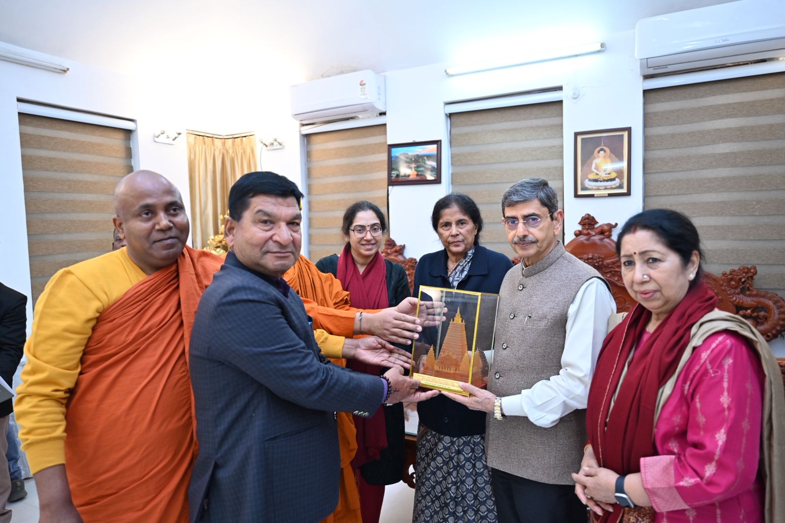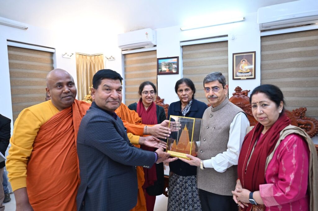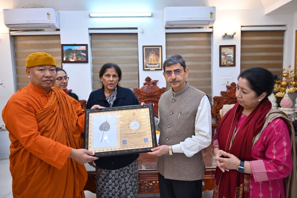 The visit concluded on a gracious note with Dr. Mahasweta Maharathi and members and Bhikkhus presenting mementos to the Hon’ble Governor on behalf of the BTMC. These included a Holy Bodhi Leaf, an Art Portfolio featuring paintings on Buddhist themes by renowned artist Upendra Maharathi, a Pictorial Documentation of the Mahabodhi Mahavihara Temple Complex, and a book on the Holy Bodhi Tree ( Maintenance and Conservation).