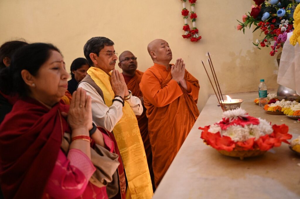 Accompanied by the monastic dignitaries, Shri R. N. Ravi and family offered prayers at the main shrine, the sanctum sanctorum housing the statue of Lord Buddha. Hon’ble Governor also mediated in the sanctum sanctorum in front of holy Buddha statue. The delegation then proceeded to the ancient and revered Bodhi Tree, under which Lord Buddha attained enlightenment. In a solemn and spiritually charged atmosphere, the Venerable Monks chanted sacred mantras, invoking blessings and peace for Shri. R. N. Ravi and his family.